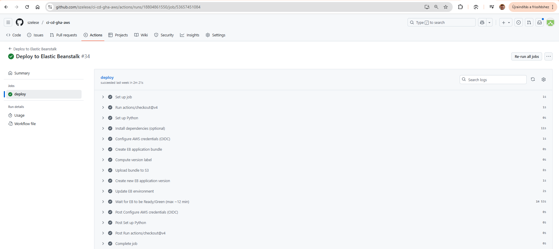 mysite-env-2) running on the Python 3.11 platform.token.actions.githubusercontent.com with the audience sts.amazonaws.com.GitHubOIDC-EBDeploy) that trusts the OIDC provider (step 2). This role’s Trust Policy should be limited to your specific repository (szelese/ci-cd-gha-aws) and main branch.deploy.yml workflow, such as: